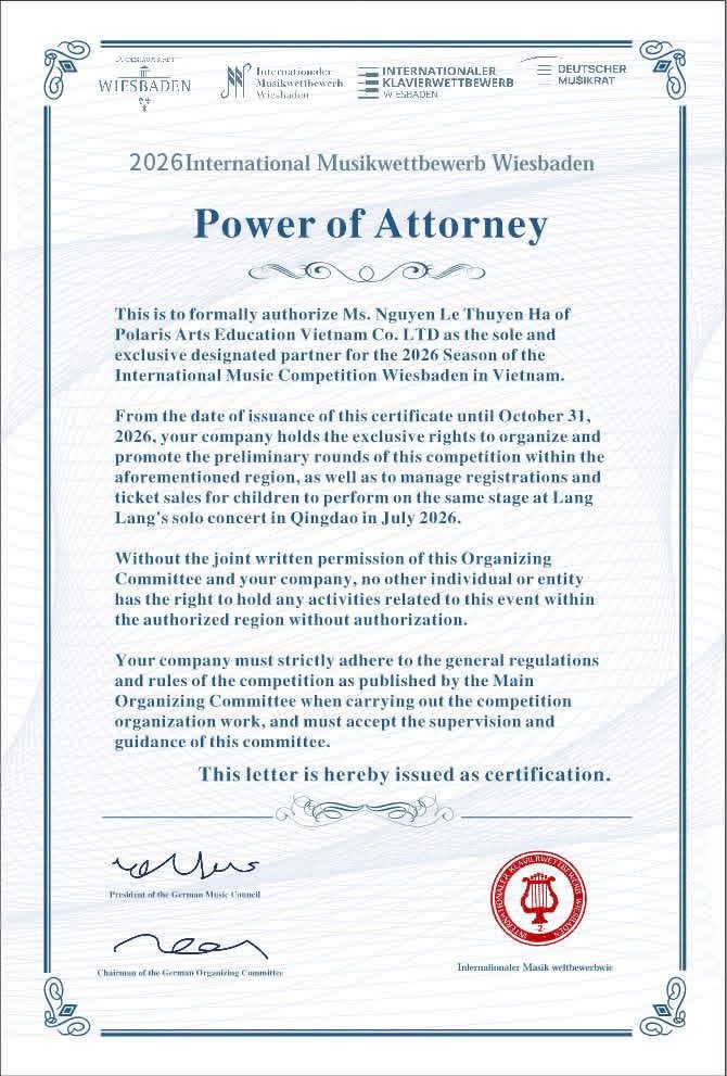 Đồng thời, Polaris Arts Education Vietnam vinh dự trở thành đối tác độc quyền tại Việt Nam của International Music Competition Wiesbaden – một trong những cuộc thi âm nhạc quốc tế uy tín tại châu Âu. Sự hợp tác này đánh dấu bước tiến chiến lược trong hành trình kết nối tài năng trẻ Việt Nam với môi trường nghệ thuật chuyên nghiệp và hệ sinh thái biểu diễn quốc tế.